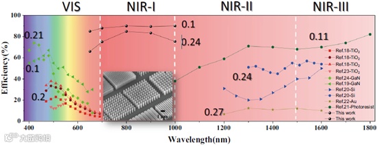 数值孔径(NA)在0.1以上的宽频消色差超透镜的效率用不同的颜色表示。本文还介绍了这项工作的结果(黑点)。插图为柱高为1500nm的TiO2纳米结构的倾斜扫描电镜图像。