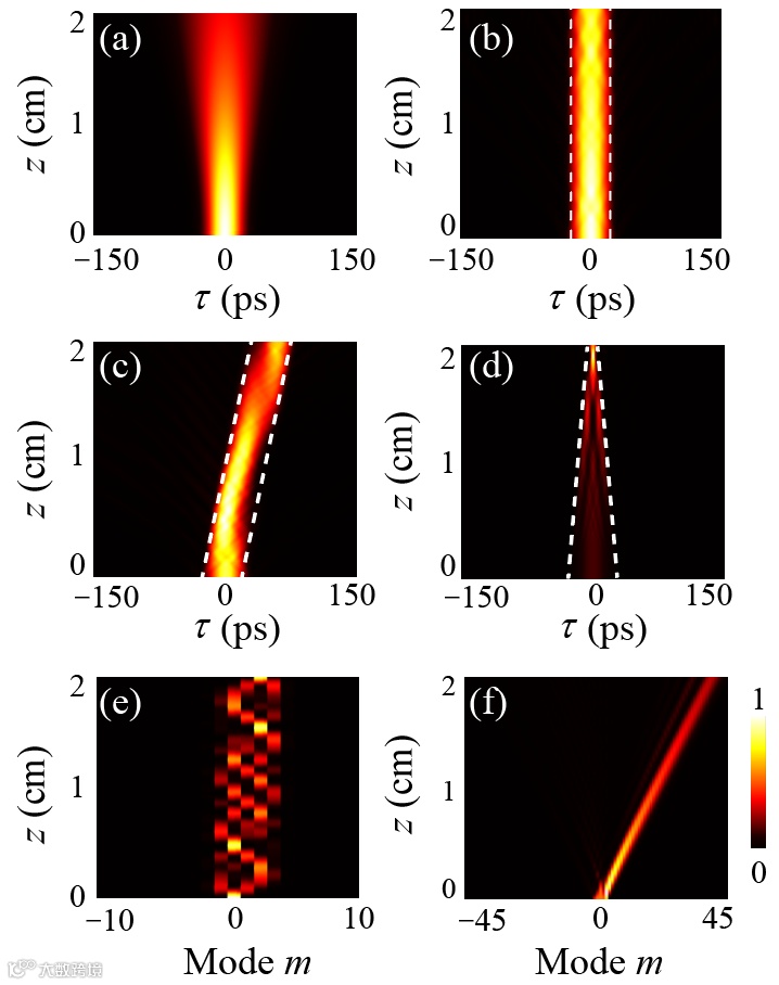 ,若在时间轴上,相位分布区域的宽度等于脉冲的宽度、中心与脉冲的中心重合,且相位分布不随着z轴发生变化,那么脉冲在传播过程中不会发生展宽,始终保持着原始的脉冲形状传输(图2b)。图中白色虚线标记了相位的时间-空间分布区域。在此基础上,若改变相位分布的中心位置随着z发生变化,则可以实现快光和慢光(图2c)。此外,若相位分布的中心位置不变,但是宽度随着z逐渐减小,则可以实现脉冲的压缩(图2d)。除了在时间维度上对脉冲进行控制,频率维度上产生的等效作用力会让频率模式发生非周期的振荡,如图2e所示,从而对输出的频率模式进行操控。除此之外,还可以通过控制输入脉冲包含的模式个数,在频率维度上实现单向传输等(图2f)。该研究工作提供了一个新的控制光脉冲行为的平台,可以对脉冲同时进行时域和光谱域的调控,在光纤通信和集成光学中都有着重要的潜在应用。