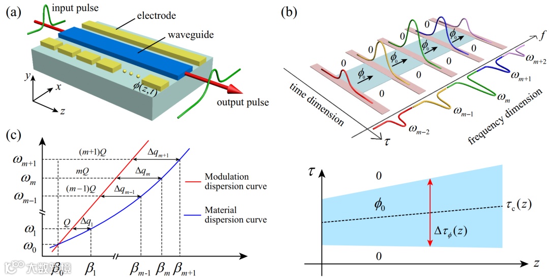 当光脉冲在色散波导中沿z轴传播时,通过电光调制可以将不同频率的模式耦合起来构造合成的频率维度。同时,由于色散光脉冲会经历时域上的衍射,因此可以将此频率上离散、时间上连续的空间称为二维的合成时间-频率空间。如果通过分段电极对电光调制的相位进行如下控制: