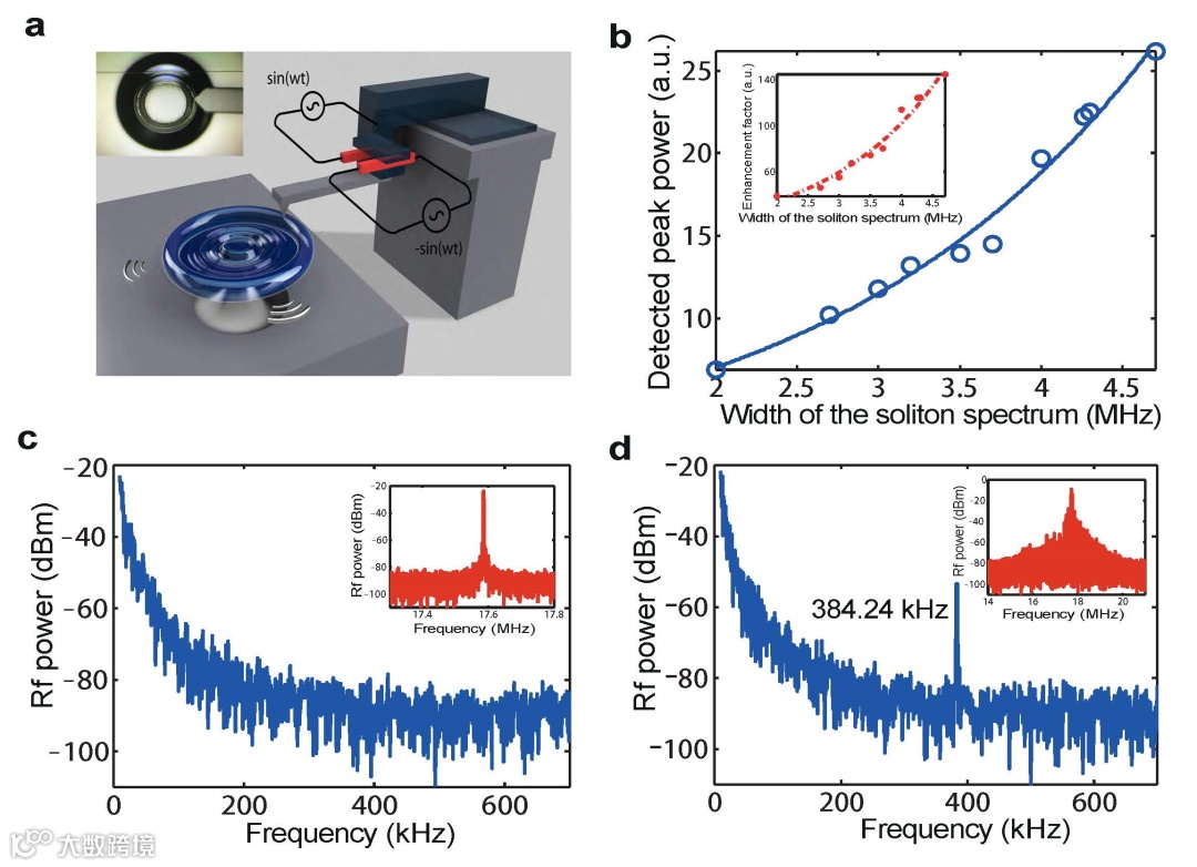 研究团队进一步将所观测到的光机械孤子用于原子力显微镜针尖低频振动探测【图4a】。实验中微型环芯腔的本征振动频率约17兆赫兹,而原子力显微镜针尖本征振动频率约384千赫兹。二者巨大的频率失谐,使得微型环芯腔做周期振动的时候,无法响应原子力显微镜针尖的低频振动(图4c)。而当微型环芯腔进入孤子区的时候,由于微型环芯腔机械运动时域上出现局域化效应,对应于频域上振动的频率响应实现了展宽,展宽的频率响应特性使得微型环芯腔对针尖的低频振动可以实现高效的响应(图4d),实验中观测到了在孤子区测量精度的极大提高(图4b)。