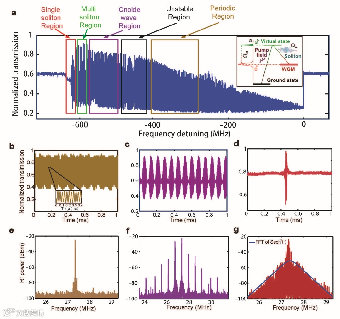 图3. 光机械孤子的产生过程。a, 随着泵浦模式和腔模之间频率失谐的变化,微型环芯腔机械运动发生了相变先后经历了不同的运动模式,包括周期模式(Periodic region)、椭圆余弦波模式(Cnoidal-wave region)和孤子模式(Soliton region)。插图:图显示了从光学模式到机械模式的能量传递机制。在泵浦模式和腔模之间频率失谐与机械运动周期相匹配条件下,光模可以有效地向机械模输入更多的能量,从而形成机械孤子。b, c, d, 周期(左)、椭圆余弦波(中)和孤子(右)区域中输出场的时域谱。输入场的频率失谐从左到右增加,我们可以观察到导频率失谐增加所导致的机械运动局部化。e, f, g, 周期(左,单峰)、椭圆余弦波(中,频梳状谱)和孤子(右,宽频带峰)状态下泵场频域中的输出谱。
