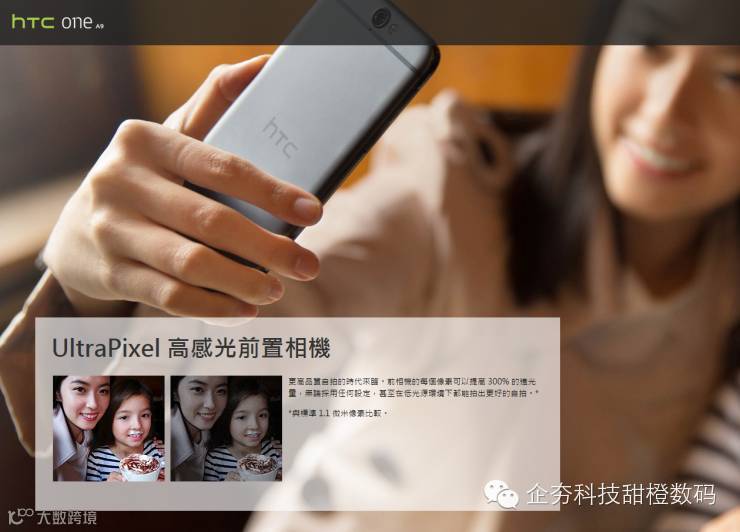 然后比较感人的是,这次 HTC 把之前引以为豪的 UltraPixel 400 万像素摄像头用在 A9 的前置摄像头上,更大的单位像素面积对于暗光下自拍而言确实是有很大的帮助的,也算是 HTC 终于做对了一次。