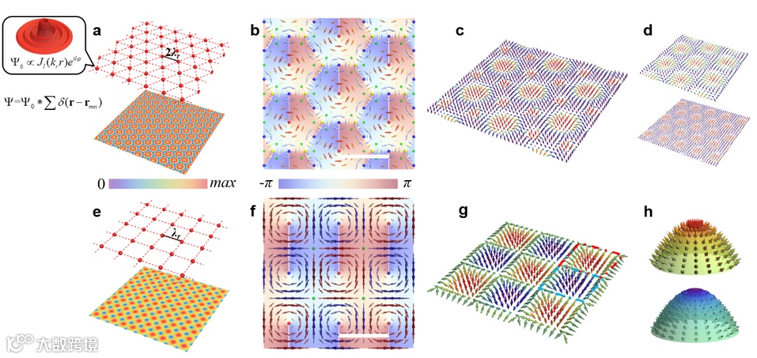 图2 (a-d)六角对称下的Abrikosov能流涡旋及光学斯格明子阵列;(e-h)四角对称下的Staggered能流涡旋及光学半子阵列