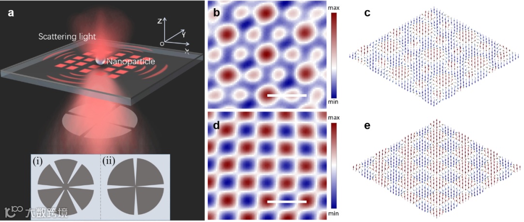 ,两种能流涡旋结构分别对应光学自旋斯格明子及半子阵列(图2c,g)。同时,课题组发现,在自旋-轨道耦合缺失的情况下,也即光学涡旋的轨道角动量l=0时,系统的自旋为0,此时由自旋矢量构成的自旋拓扑结构退化为由电场矢量构成的光学拓扑结构,并且受到了与上述一致的对称性约束。课题组的研究人员通过求解方形边界下能量哈密顿量的极值,验证了拓扑半子结构的构型。进一步的,利用表面等离激元涡旋,结合具有不同对称性的强度调节光阑(图3a),在实验上分别生成了斯格明子及半子阵列,并利用自主搭建的近场扫描系统,对自旋拓扑结构进行了表征(图3b-e)。