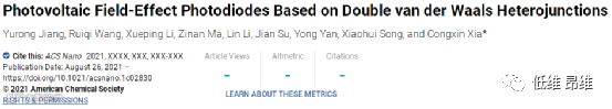 本文提出了一种带有双vdWHs的光电二极管,其中浮动vdWH的光电压作为光电栅来调制另一个vdWH的电荷载流子转移。该器件具有0.34 V的大Voc和4.1 mA·cm-2的Jsc,可以保证自供电光电探测。更重要的是,所设计的光电二极管同时表现出优异的自供电光电探测性能,在没有任何外部偏置下,R为715 mA·W-1,D为1.59×1013 Jones,响应时间为45 μs。这些结果表明,PVFED架构为高性能光电子纳米器件提供了令人兴奋的潜力。