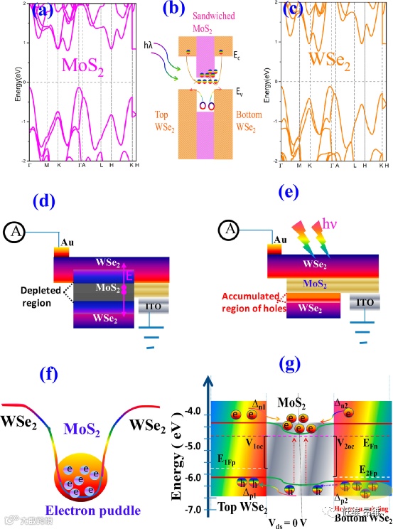 图4. PVFED的能带结构。(a&c)块材MoS2和WSe2的第一性原理计算。(b)WSe2/MoS2/WSe2的能带排列。(d&e)黑暗和光照下的电荷分布图。(f)光生电子聚集在夹层MoS2中的示意图。(g)光照状态下带隙和电荷转移的截面图。