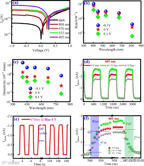 图3. PVFED作为自供电光电探测器的优点。(a)在405至808 nm不同波长照射下的I-V曲线。(b&c)不同偏置下的响应率和探测率。(d)时间相关的光电流响应。(e)零偏置下670 nm红光照射下100次循环的光电流响应稳定性。(f)放大的循环。