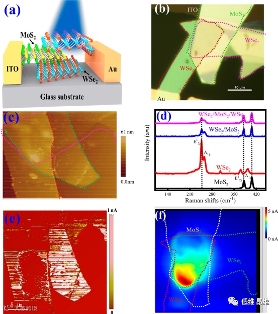 图1. PVFED器件的材料结构和特性。(a&b)PVFED器件的示意图和光学显微照片。(c)pnp器件的二维AFM图像。(d)四个不同区域收集的拉曼光谱。(e&f)在黑暗中通过c-AFM和在405 nm激光照射下通过扫描光电流显微镜绘制的PVFED器件电流成像。