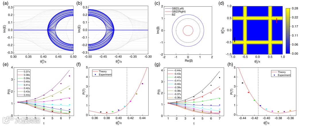 图二:非布洛赫宇称-时间对称性。(a,b)为理论计算的能谱虚部,(c)为广义布里渊区,(d)为基于广义布里渊区的理论相图,(e-h)为量子行走实验数据。