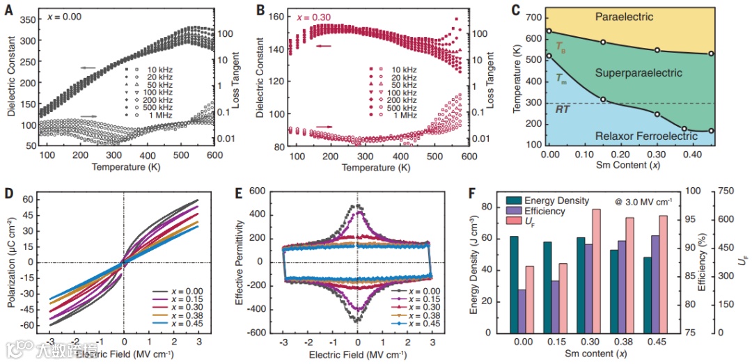 为实现室温附近超顺电态、满足实际应用需求,研究者设计制备了一系列Sm掺杂BiFeO3-BaTiO3(Sm-BFBT)的弛豫铁电薄膜(厚度约0.6 μm),通过Sm离子引入的局域化学、结构和电学异质性,以降低相变温度(图2)。结果表明,30% Sm含量下获得的室温超顺电薄膜兼具高介电极化、低介电损耗、高弛豫系数和适当的介电非线性,从而实现预期的高储能密度和显著提升的储能效率。