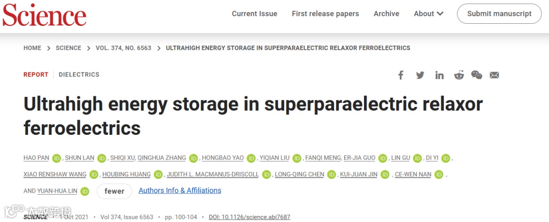 近日,Science在线刊发了题为“Ultrahigh energy storage in superparaelectric relaxor ferroelectrics”的研究论文,报道了清华大学林元华教授、南策文院士研究团队与中科院物理所金奎娟课题组、谷林课题组、北京理工大学黄厚兵课题组等合作,在储能介电材料研究方面的最新进展。在此前工作(弛豫铁电体中构建多形态纳米畴实现高储能密度;Science 365, 578 (2019))基础上,他们通过对弛豫铁电薄膜材料的稳定的超顺电态设计,进一步实现了储能性能的综合提升,获得了152 J cm-3的超高储能密度。