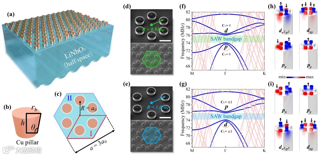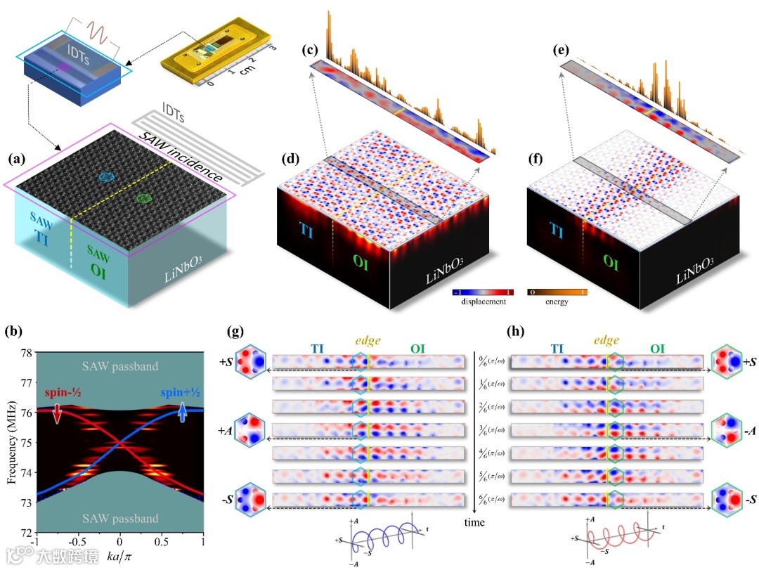 图2. (a-c)基于铌酸锂基底的声表面波声子晶体;(d, e)“普通绝缘体”及“拓扑绝缘体”的样品照片; (f, g)蓝色为对应的声表面波能带;(h, f)带隙上、下的声表面波模态。