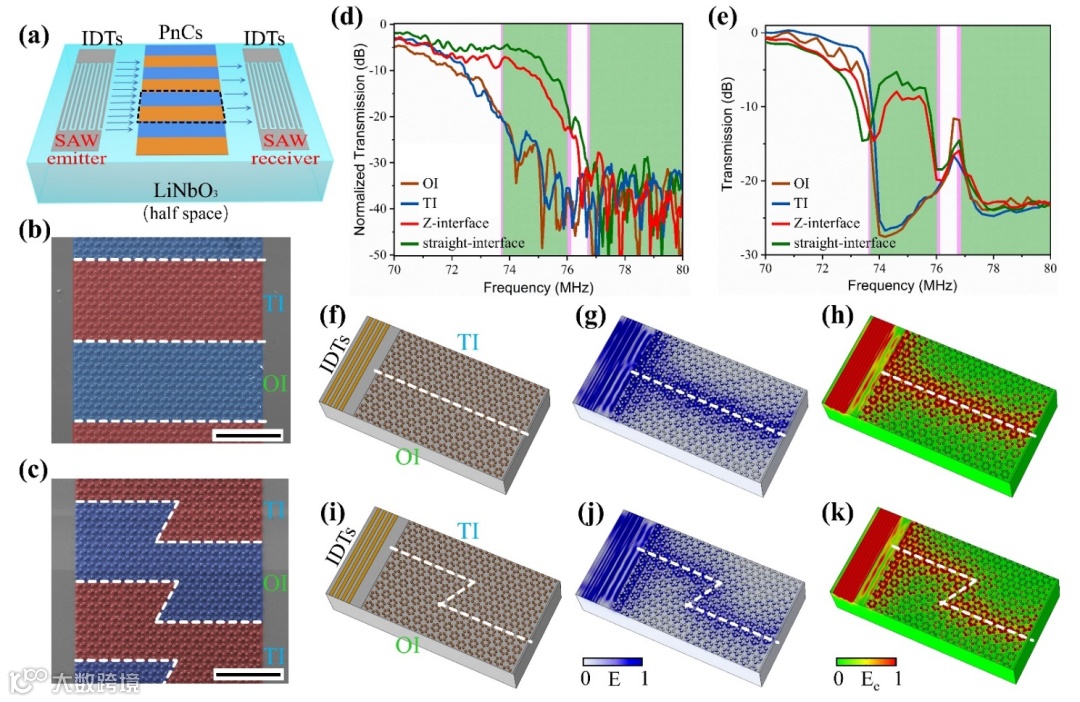 图4. 单片集成在声表面波拓扑传输线原型器件。(a)器件/实验示意图;(b, c)直波导及弯曲波导的样品照片。(d,e)网络分析仪测量的传输线S21参数及模拟结果。(f-k)两种声表面波波导中的声场分布及静电场分布。