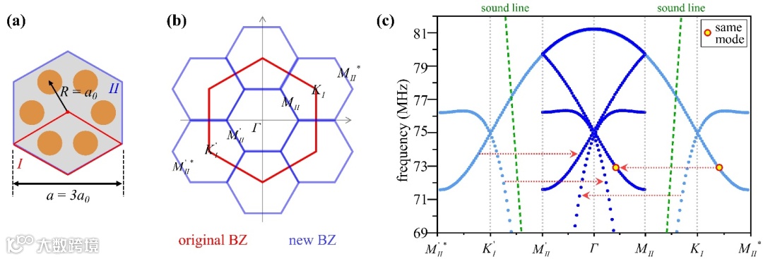 图1.采用经典能带折叠方法研制声表面波拓扑声子晶体。(a)元胞结构;(b)简约及拓展布里渊区;(c)声表面波声子晶体中的色散曲线,处于Γ点的四重简并点在拓展布里渊区中位于声锥以外,为纯正的非辐射表面波态。