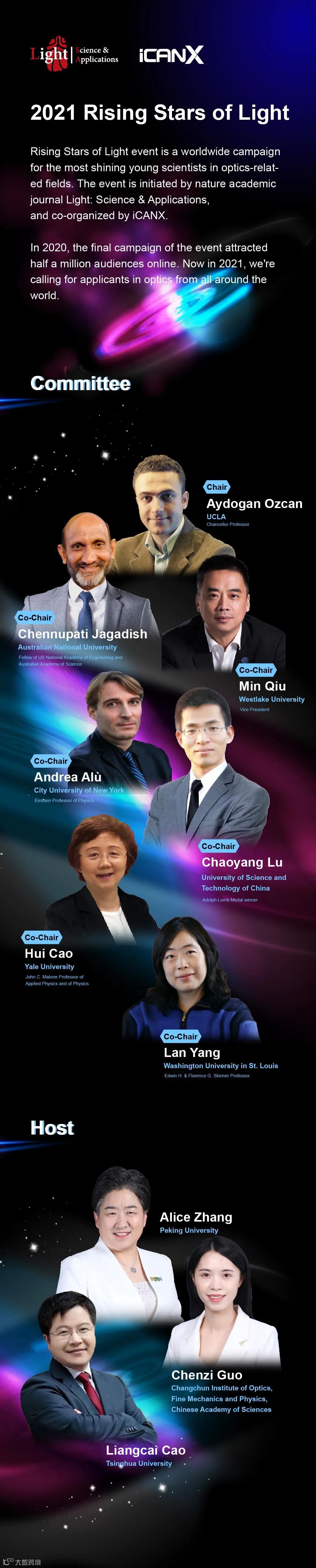 2021年Rising Stars of Light将继续由Light: Science & Applications、iCANX共同主办,共主席包括:美国发明院院士、加州大学洛杉矶分校校长教授Aydogan Ozcan,澳大利亚科学院院士、美国工程院外籍院士、澳大利亚国立大学杰出特聘教授Chennupati Jagadish,美国科学院院士、耶鲁大学杰出特聘教授Hui Cao,圣路易斯华盛顿大学杰出特聘教授Lan Yang,西湖大学副校长、西湖大学杰出特聘教授仇旻,中国科学技术大学教授陆朝阳,纽约市立大学杰出特聘教授Andrea Alu。