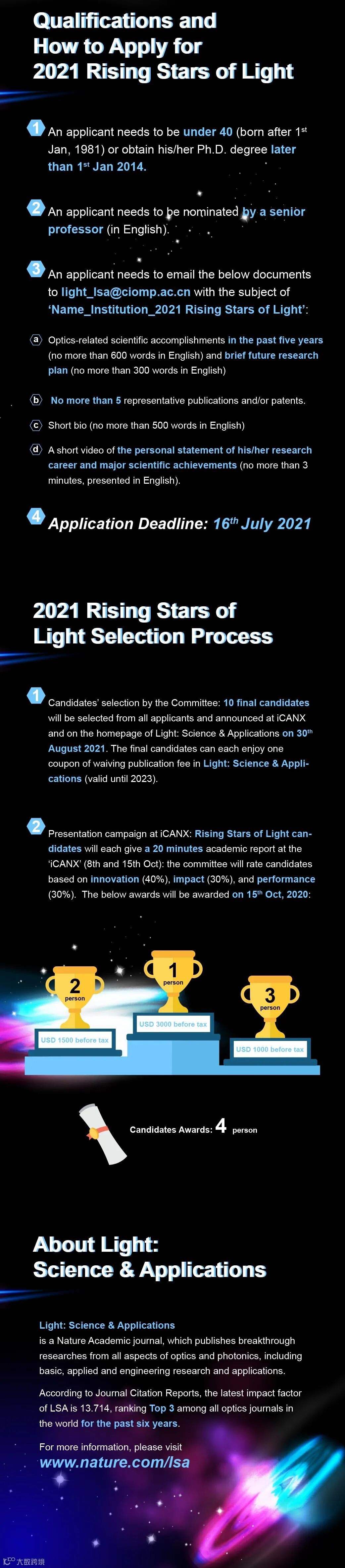 Rising Stars of Light是世界顶尖光学期刊Light: Science & Applications于2018年发起的一年一度的评选活动,旨在选拔国际光学相关领域的顶尖青年科学家。2020年,Rising Stars of Light首次搬至线上,与iCANX Talks联合举办,决赛全球观看人次超过50万(观看回放1 >)(观看回放2 >)。