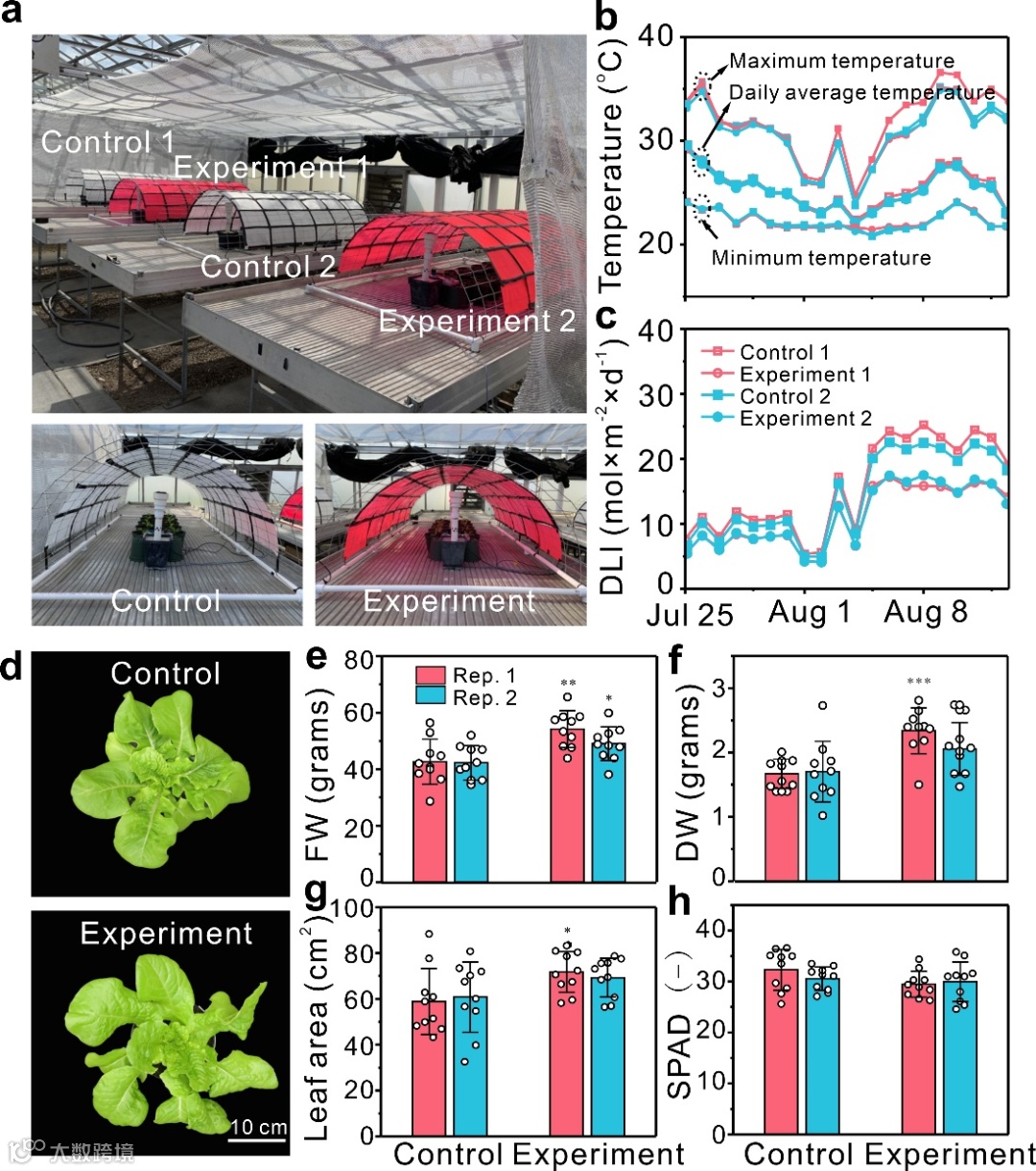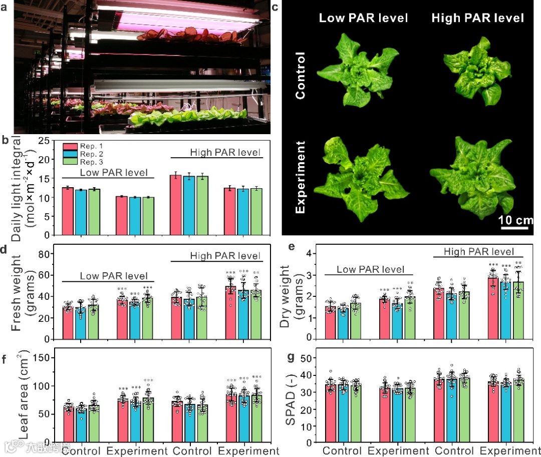 图二. 转光膜应用于室内可控环境和LED灯照条件下生菜生长情况