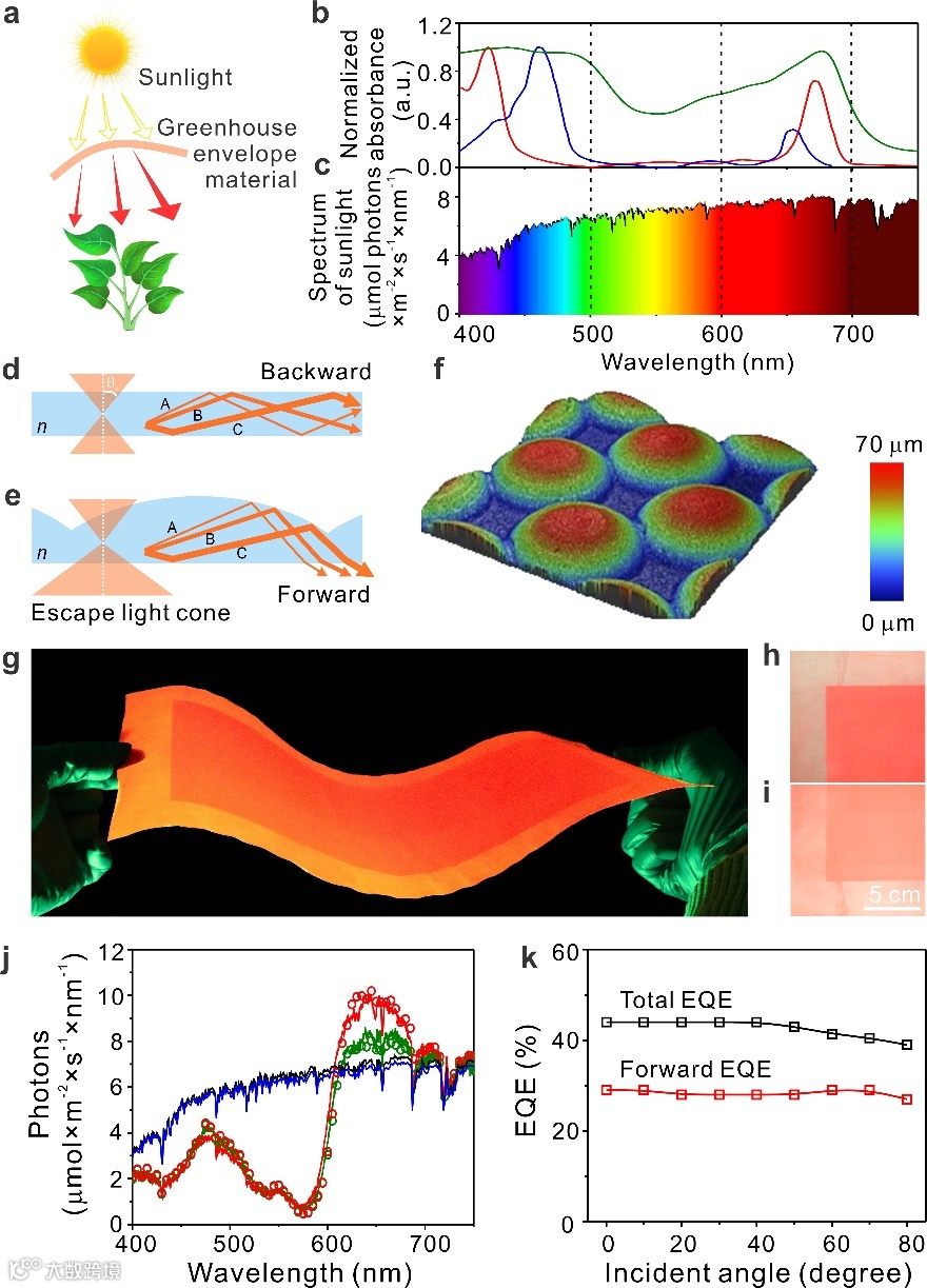 光合作用是一切生物生存、繁衍和发展的根本保障。绿色植物利用太阳的光能,同化二氧化碳和水制造有机物质并释放氧气。然而,不同波长的光线对于植物光合作用的影响是不同的,植物光合作用所需要的光线波长在400-700 nm左右。其中,400-500 nm(蓝色)以及600-700 nm(红色)的光线对于植物光合作用尤为重要,此波段植物光合作用相对量子效率较高。这种光质效率的差异为确定以红光和蓝光为核心的温室植物栽培提供了初步的科学依据。然而,现代设施农业植物生长补光或者全人工光种植的植物需要消耗大量的照明用电。目前,转光膜在设施园艺生产上得到了广泛的关注与应用。其利用膜中转光剂将不利于植物生长或对植物光合作用不大的太阳光转化成对植物光合作用更为有效的红橙光及蓝光,通过改变透过膜的光质来提高农作物光合作用强度,为促进农作物生长提供了一种新方法。然而,普通转光膜具有外量子效率低的问题,其主要原因在于其低效的光提取能力。为此,研究团队利用薄膜表面光学微结构,操控材料内部转换光的发射方向,为提升转光膜取光效率和外在量子效率提供了一种新的研发思路。