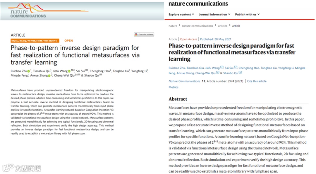 该项研究成果以“Phase-to-pattern inverse design paradigm for fast realization of functional metasurfaces via transfer learning” 为题发表在Nature Communication上。