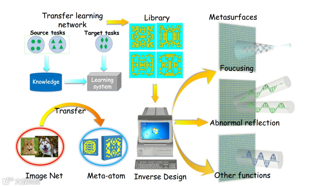 迁移学习是一种基于深度学习的机器学习新框架。深度学习是机器学习的典型方法之一,在分类、回归、聚类等方面都取得了很高的成就。然而,传统的深度学习只适用于训练数据和测试数据具有一定特征空间和分布的任务。如果特征空间或分布发生变化,该模型可能不适合新任务。在这种情况下,需要对深度学习网络进行再训练,这需要花费大量额外的时间和数据。在许多实际场景中,获取海量的数据对深度学习网络进行再训练是非常耗时的,而在数据不足的情况下对深度学习网络进行再训练的实际操作难度太大。而迁移学习的出现,恰好解决了这一问题,对已经训练好的网络架构进行结构的迁移,可以实现网络参数的共用,进而实现知识的共享。图1显示了文章的主要设计思想,通过使用迁移学习网络实现了将图像识别领域知识迁移到超表面设计中,通过建立相位库的方式可以进一步实现对功能超表面的逆向设计。