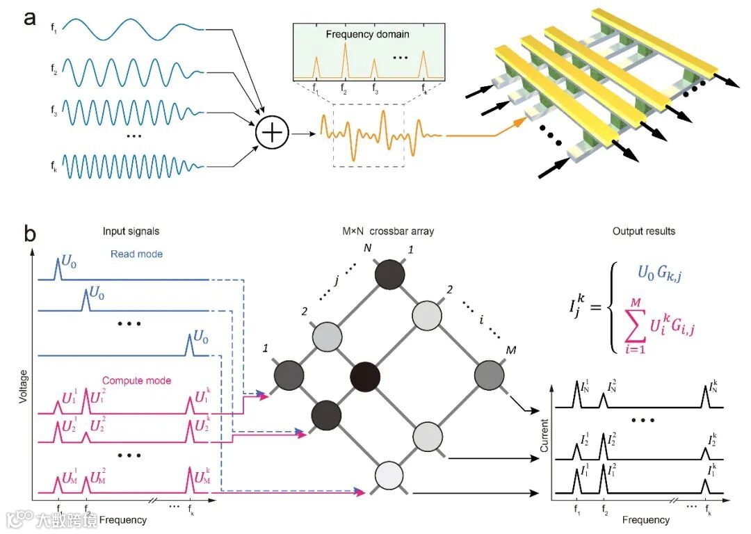 图1. 基于忆阻器交叉阵列的频分复用计算。a 利用忆阻器交叉阵列实现频分复用计算,其中信息的载体是多种分立频率信号合成的时间上连续的信号。b 利用频分复用计算进行并行读取和并行计算的图解。在读取模式下,忆阻器阵列的每行输入不同频率、相同幅值的单一频率信号;而在计算模式下,忆阻器阵列每行输入的信号有着多种频率,每个频率有着不同的幅值,忆阻器不同行不同频率上输入的数据构成一个输入矩阵。在读取和计算两种模式下,忆阻器交叉阵列每一列的输出电流的频谱中包含了多种的频率分量,共同构成了一个输出矩阵。在计算模式下,一步即完成了输入矩阵与忆阻器权值矩阵的点乘运算。