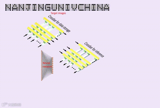 进一步,研究团队将两个分别工作在读取和计算模式下的阵列进行级联,实现了并行读取、并行识别、与识别结果传输的功能演示(图2)。在该演示中,第一个阵列储存了代表16张“NANJING UNIV CHINA”的5*5像素的字母图片,第二个阵列储存了用于识别上述9类字母的神经网络权重。当给第一个忆阻器阵列按列施加不同频率、相同幅值的电压信号时,在第一个阵列内完成了并行读取的过程。通过电流-电压转换,第一个阵列的信息被直接加载到第二个阵列的输入信号中。通过第二个忆阻器阵列的推理之后,完成了对16张图片的同时分类。此外,频分复用计算的输出信号和无线频分复用通信系统中的通讯信号相互兼容,还可以通过无线射频模块直接完成识别结果的无线传输。