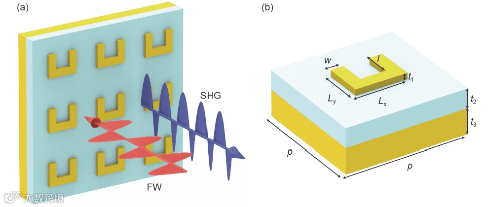 2006年,德国科学家Stefan Linden教授等人在近红外波段用飞秒激光泵浦具有中心反演对称破缺的金磁共振超构表面,观察到了倍频信号的产生。然而,金开口环上的倍频效率通常比较低。为进一步解决这一问题,本文设计并制备了一种纳米光腔超构表面,并通过三个步骤实现了倍频光的高效率产生。首先,通过结合磁共振和纳米光腔共振等物理机制,可以很好地将泵浦光耦合到超构表面上;随后,将倍频光设计在超构单元的等离激元共振模式,实现倍频光的耦合输出产生;最后,优化超构表面的晶格常数,实现倍频光的高效率辐射。本文的实验与理论结果显示,与2006年最初提出的单层金光学超构表面相比,纳米光腔超构表面上的倍频信号可增强约800倍。
