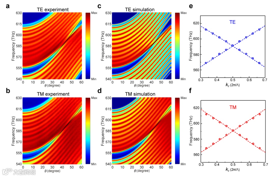 研究人员设计了一个双层AB型一维介质光子晶体(图1a),通过研究其TE和TM两种偏振的能带,得到了能带简并条件,并证明了该系统中存在四重简并的狄拉克节线型色散;又由于系统中固有的面内旋转对称性,能带简并是环形的。接着,研究人员通过变角度透射测量,提取得到三个方向的能带(图2)。
