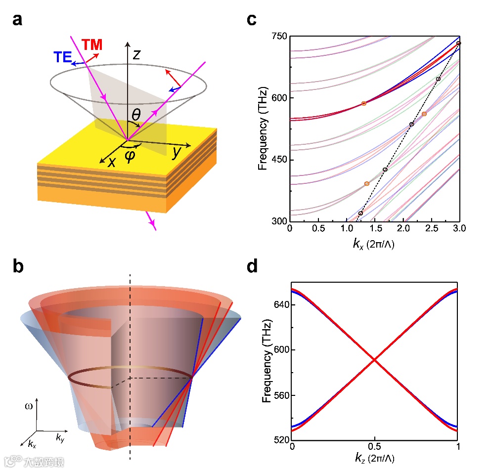 图1 a: 光子晶体结构示意图;b: 四重简并的狄拉克节线环(金色环)附近的面内色散示意图;c和d: TE(蓝色)和TM(红色)偏振下kx和ky方向下的色散。