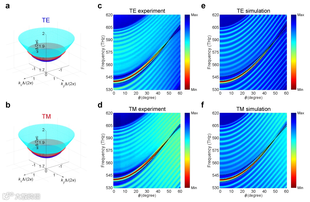 图3 a和b: TE和TM偏振宽带简并的“双碗”表面态;;c-f: 两种偏振下光子晶体/银膜样品的角分辨反射测量和模拟结果。