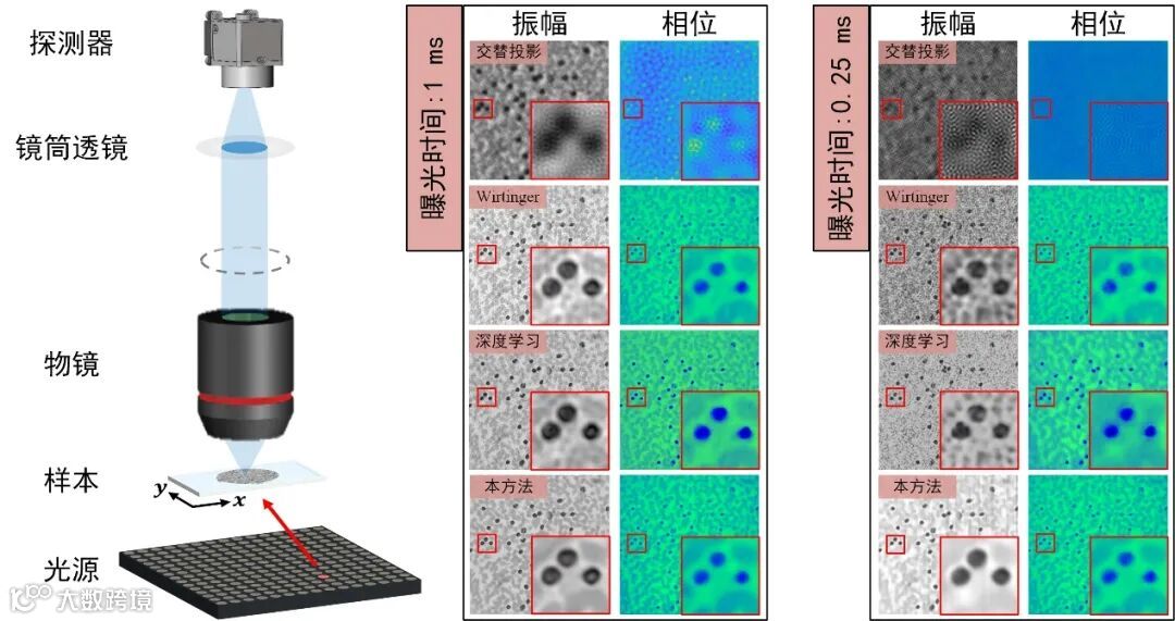 傅里叶叠层成像(Fourier Ptychographic Microscopy,FPM):傅里叶叠层成像是一种宽视场高分辨率成像技术,其在不同的照明角度下采集若干张对应不同空间子频谱的低分辨率图像,然后使用相位恢复算法重建完整频谱,获得宽视场高分辨的复数域图像。仿真结果表明,所提出方法重建结果的峰值信噪比相比交替投影方法提升近10dB,运行效率领先Wirtinger优化方法一个数量级。实验结果表明,该方法能够高质量重建0.25ms短曝光时间的血细胞样本,而传统方法需要高达4ms才能达到相似的重建质量。所提出方法能够有效降低曝光时间,从而大幅降低光毒性。