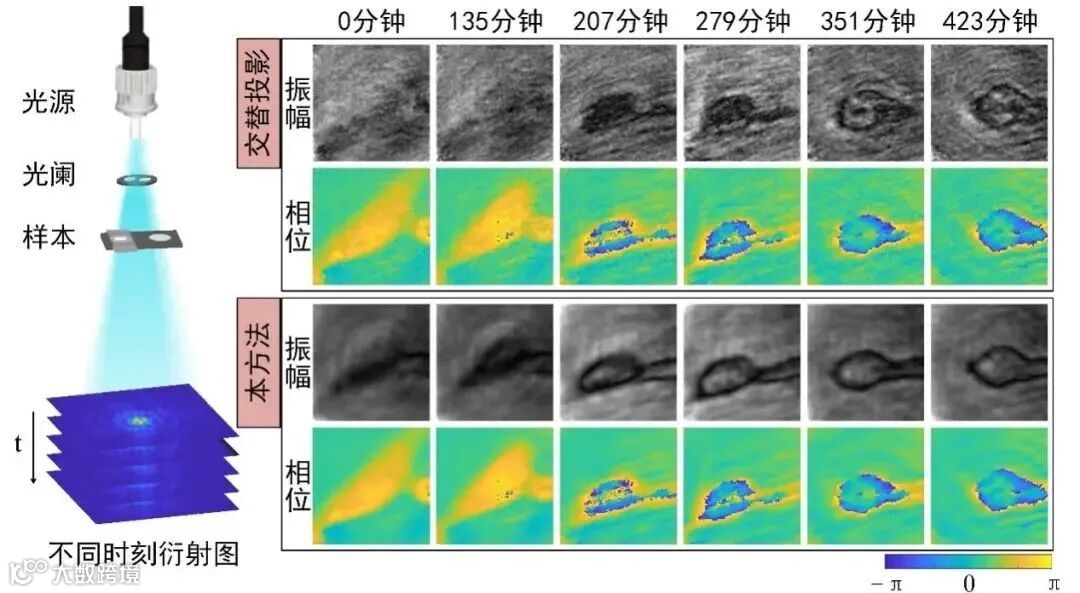相干衍射成像(Coherent Diffraction Imaging,CDI):相干衍射成像是一种无透镜的复数域成像方式,其使用相干光照射目标,并使用光电探测器记录远场衍射图,最后利用相位恢复算法从衍射图中重建目标的幅值和相位。仿真结果表明,所提出方法的重建峰值信噪比(PSNR)比传统方法提升近6dB,结构相似性(SSIM)提升近0.3。实验结果表明,使用所提出方法重建的胶质母细胞瘤复数域图像保真度高、噪声小,能更加清楚地观测细胞结构信息和融合过程,有效提升了细胞动态观测的质量。