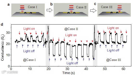 研究人员利用光照射金属电极或基底实现了电导开关,通过控制入射光的照射位置可以很好地控制电流开关方向,因此通过改变激光照射位置实现了三态电导开关。通过模拟分析揭示了原子开关效应和纳米间隙调制主要来源于光照射下电极基底所产生的热膨胀梯度。当逐渐增大光照强度时,可以以亚埃米级精度调控两电极间的纳米间隙,为单分子结的研究提供了一种远程调控的片上断裂结技术。当激光光束的聚焦光斑足够小,使得可寻址分子结阵列成为可能。本课题得到中国国家自然科学基金、德国国家自然科学基金、韩国国家创新项目及天津市自然科学基金的支持。论文得到了Fraser Stoddart教授 (2016年诺贝尔奖获得者) 的指导。