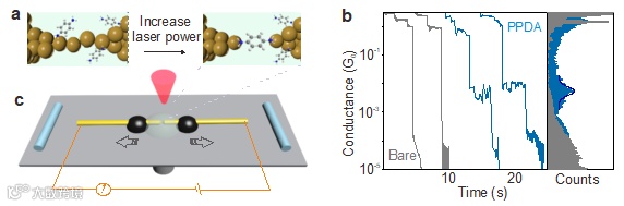 图 6 通过调节光照强度,逐渐增大电极间距从而实现片上裂结技术。 (a) 片上裂结技术测量分子电导值示意图,(b) 在电极分离过程中,有无分子时的电导曲线,及对应的电导统计直方图。