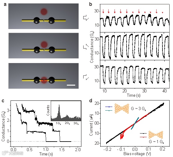 图 2 光照下纳米结电导值响应曲线。(a) 光照射位置及对应的纳米结电导值响应曲线 (b);(c) 光照导致纳米结断裂,对应电导值呈现量子化台阶变化。 (d) 光照下纳米结/原子结对应的I-V曲线。