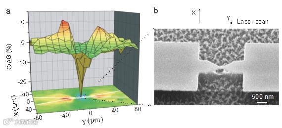 图 5 激光照射微纳结构样品不同位置时,电导响应的空间分布图。(a) 当激光逐点扫描微纳样品不同位置时,对应电极两端电导值变化情况。(b) 电子束光刻制备的悬空纳米结构SEM 照片。