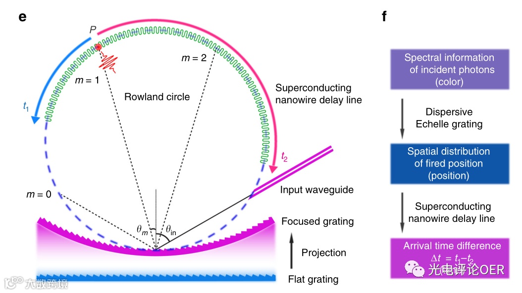 图 1 设备结构和工作原理。a-d,设备的三维结构图。片上聚焦梯形光栅作为波长鉴别微光子元件,而超导纳米线同时作为单光子探测器和缓慢的微波延迟线,以连续绘制分散光子。该纳米线以高k介质材料AlOx和顶部金属地面Al包裹,形成慢速微波传输线。e,安装示意图。输入波导和超导纳米线安装在罗兰圆上,罗兰圆与聚焦光栅线内部相切。聚焦光栅是从一个曲率半径等于罗兰圆直径的平面光栅上投影出来的。f,信号转导通路及器件工作原理示意图。