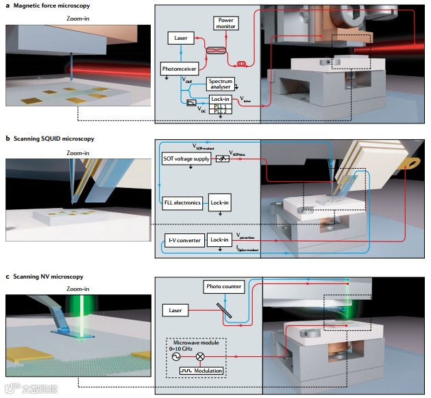 图 1:磁力显微镜、扫描超导量子干涉器件显微镜superconducting quantum interference deviceSQUID 显微镜和扫描氮空位中心nitrogen-vacancy centreNV 显微镜的示意图。