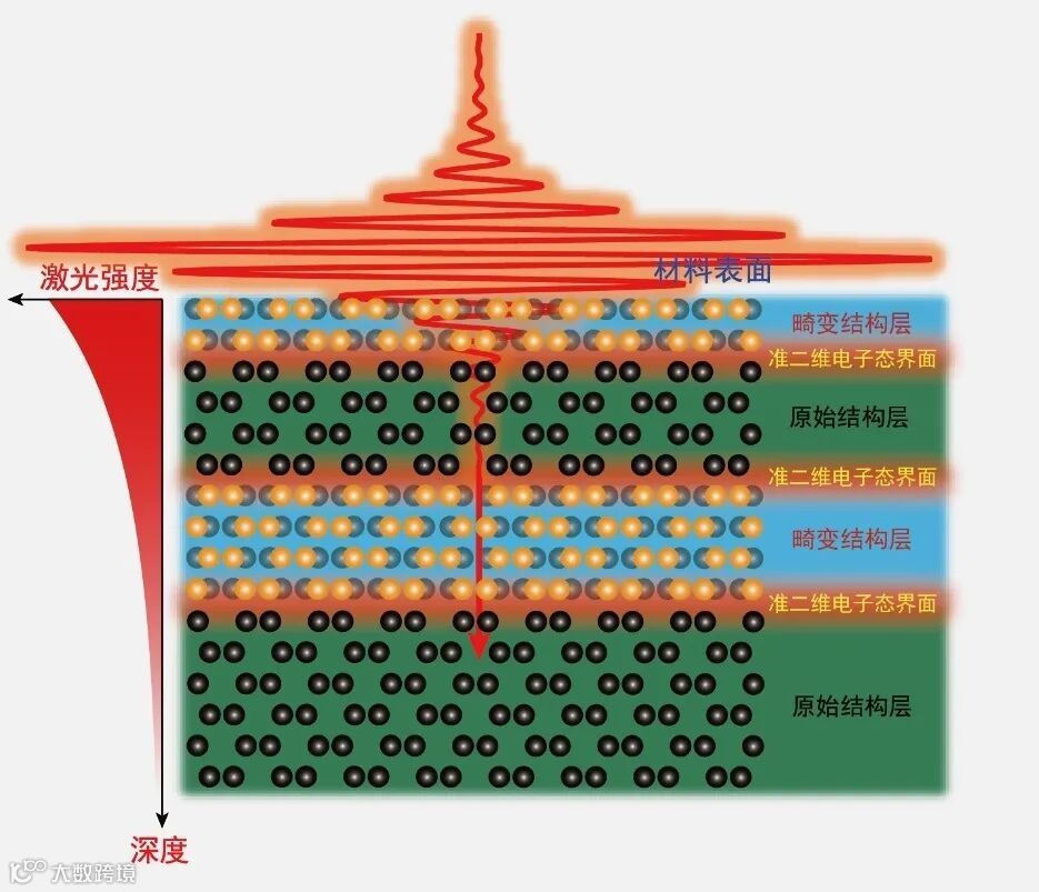 二维电子态中存在众多奇异的量子现象,如量子霍尔效应(1985年诺贝尔物理奖)、石墨烯中的狄拉克电子态(2010年诺贝尔物理奖)和超导增强等。这些二维电子态通常通过机械剥离、人工异质结、分子束外延生长等方法制造人工结构来实现;本研究提出并实现了在量子材料中利用超快激光调控产生二维电子态的新方法。该方法利用在特定激光强度下激发相干电子—声子相互作用所引起的材料晶格宏观周期性畸变,结合激光在材料中由于穿透深度引起的强度分布,从而导致这种晶格畸变在材料中分层出现并在晶格畸变层与原始层之间实现了一种长程有序的二维电子态。