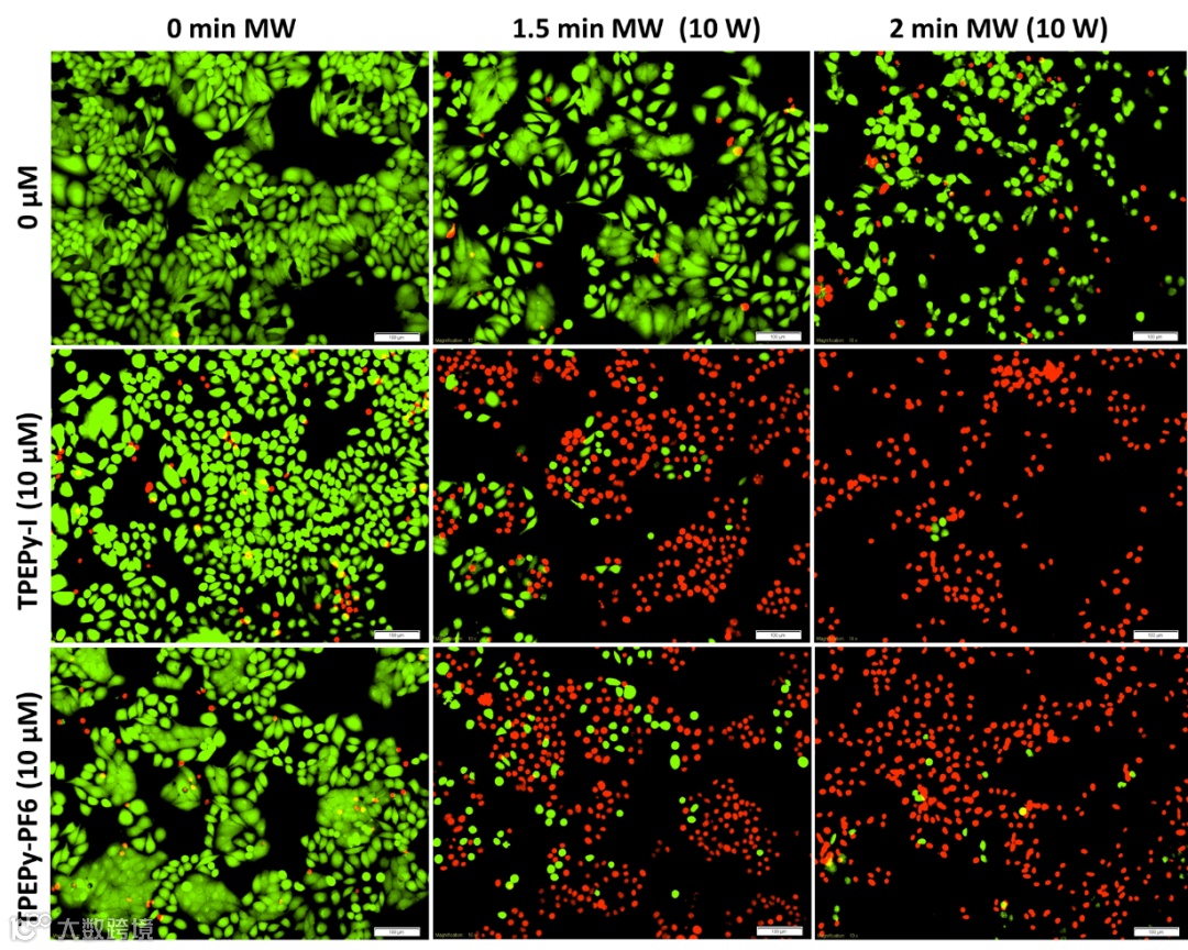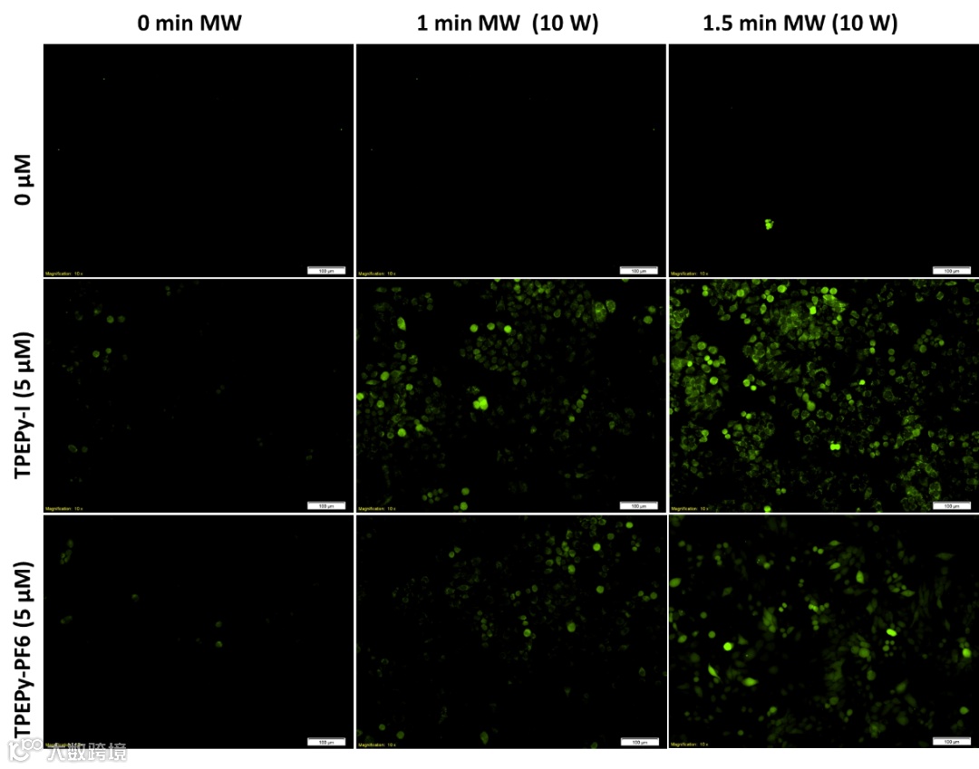 经过研究,陈伟和汪凌云团队的研究人员发现,用微波和聚集诱导发光体(AIEgens)作用可以非常有效产生活性氧从而有效杀死癌细胞 (图2,3 4)。