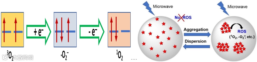 图2:左边为活性氧ROS形成示意图,右边为AIEgen介导的微波诱导光动力治疗癌症示意图。