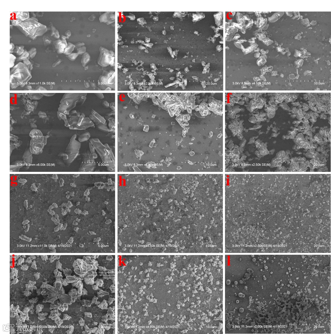 图1:代表性聚合发光体的扫描电镜成像 (a-c) TPEPy-I 粉体样品, (d-f) TPEPy-PF6 粉体样品, (g-i) TPEPy-I里加了90%的水, and (j-l) TPEPy-PF6 里加了90%的水。
