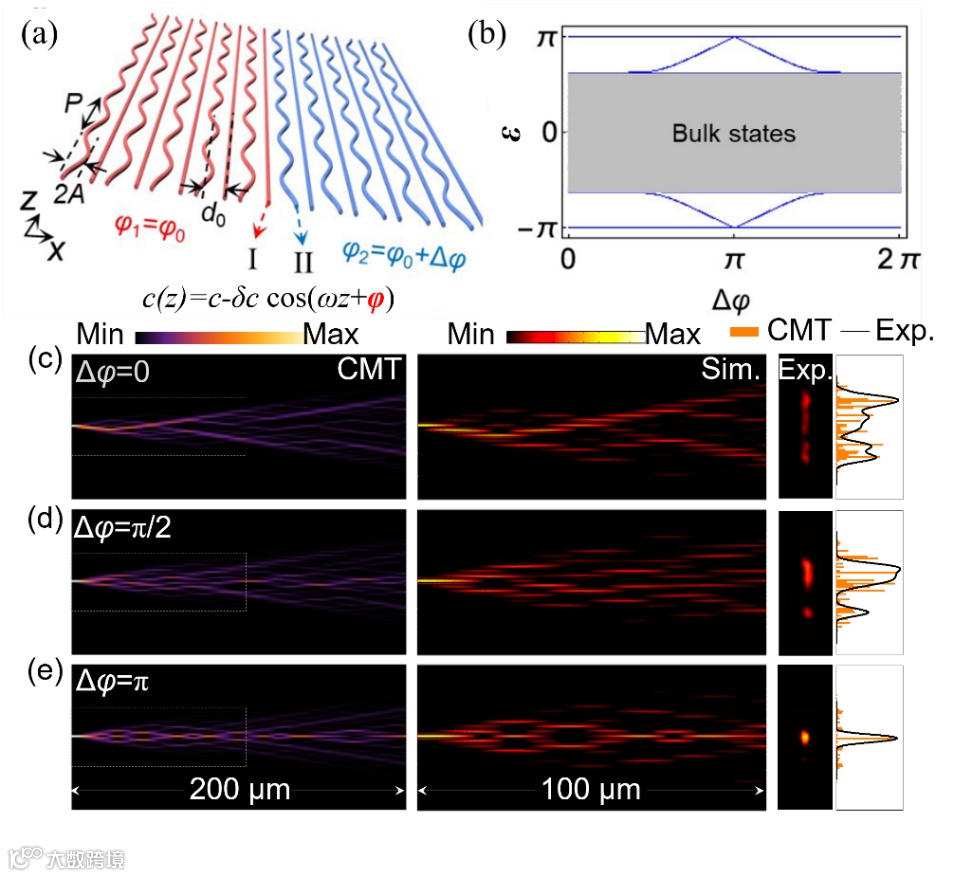 图1. (a) 拓扑相相同而Floquet规范场不同的两个波导阵列形成规范相变界面。(b) Floquet规范差Δφ导致系统准能量ε的变化。(c) 耦合模理论计算、有限元数值模拟和实验观察到的在不同Δφ下的光场演化。