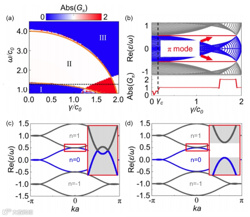 图 5. (a) 拓扑不变量Gπ随频率ω与增益损耗大小γ变化相图。(b) 系统准能量随增益损耗变化,可以看到带隙中π模式的出现。 (c, d)厄米和非厄米体系能带,厄米体系中本闭合的π带隙(c)由于增益损耗的引入被打开(d)。