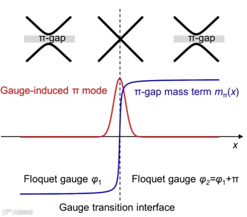 成功在实验上演示了这种规范场相变诱导产生的拓扑π模之后,研究人员进一步揭示了其背后的物理机理,发现两个Floquet规范相反的体系的哈密顿量由于规范相变而具有相反的Floquet-Dirac质量项。类似于Jackiw-Rebbi模型,这种π能隙质量项的反向会使得Floquet能带反转,从而导致在两个具有不同规范的系统界面上产生边界态(见图3)。