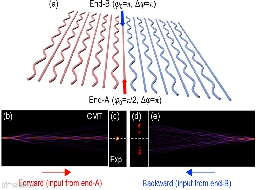 图2. (a) 非对称拓扑传输波导阵列示意图。理论(b,e)和实验(c,d)中观察到的非对称光场传输行为。