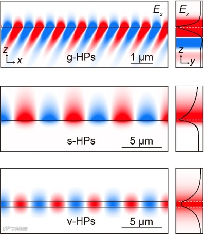 (上)“幽灵”极化激元模式、(中)表面极化激元模式、(下)体极化激元模式。