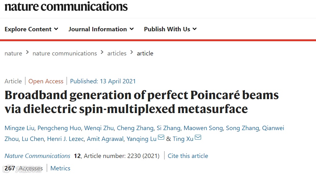 该研究成果以“Broadband generation of perfect Poincaré beams via dielectric spin-multiplexed metasurface” 为题发表于综合性学术期刊《Nature Communications》 (DOI: 10.1038/s41467-021-22462-z)。南京大学现代工程与应用科学学院徐挺教授与陆延青教授为论文通讯作者,南京大学为论文第一单位,合作单位包括华中科技大学与美国国家标准技术研究院。本工作得到了科技部重点研发计划、国家自然科学基金、江苏省双创团队等项目资助,以及人工微结构科学与技术协同创新中心、固体微结构物理国家重点实验室等平台的大力支持。