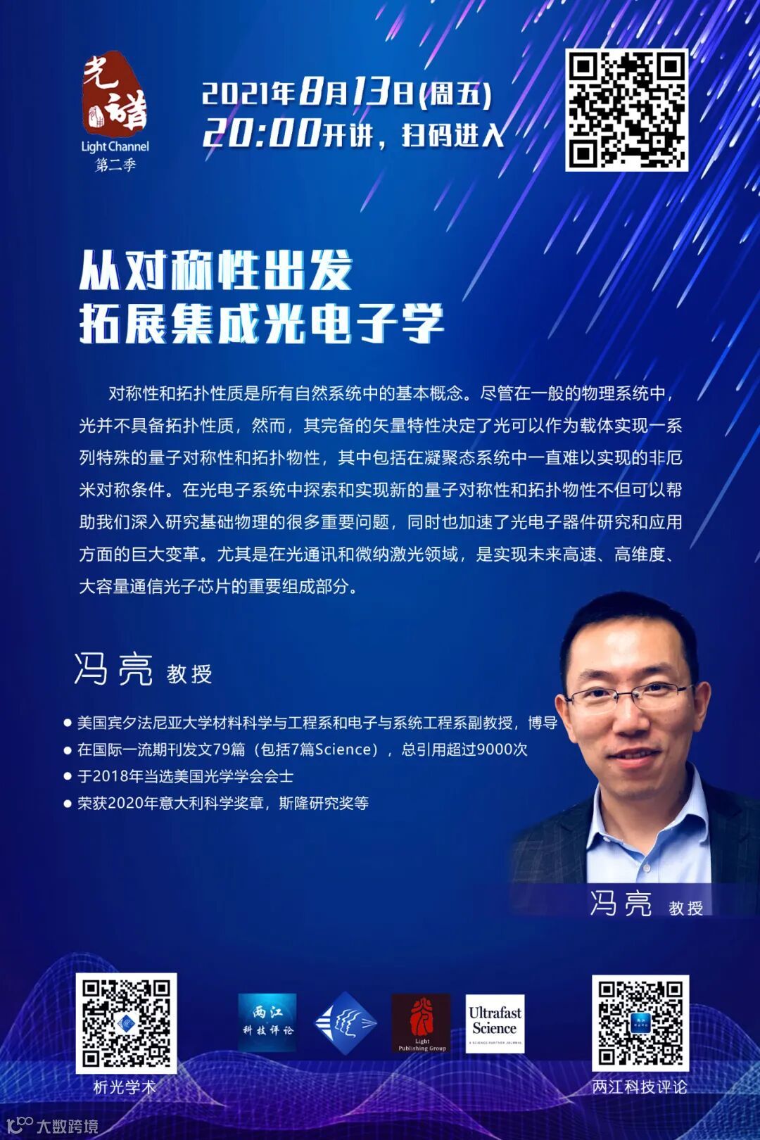 冯亮,美国宾夕法尼亚大学材料科学与工程系和电子与系统工程系副教授,博导。分别于2002年和2005年在南京大学获得物理学学士和硕士学位, 2010年在美国加州大学圣迭戈分校获得电子工程博士学位。其后在加州理工学院和加州大学伯克利分校进行博士后研究。冯亮教授主要从事集成光电子学、量子光学物理及器件方面的的研究。他在国际一流期刊发文79篇(包括7篇Science),总引用超过9000次。因其在非厄米和拓扑光子学方面的原创性贡献,冯亮教授于2018年当选美国光学学会会士,并荣获2020年意大利科学奖章,斯隆研究奖等。