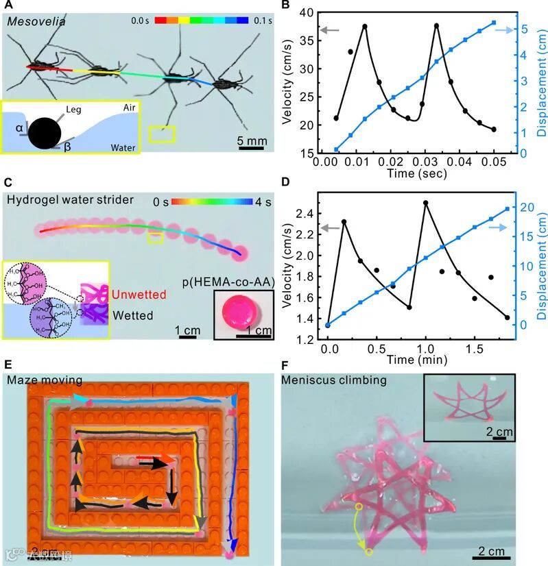 研究团队探索发现其运动机理和自然界的水黾在水面的运动存在共通之处。如图1A和1C所示,都通过表面张力的差异驱动自身在水面运动;并且如图1B和1D所示,运动速率的变化规律也非常一致。通过设计活性水凝胶材料的形状、材料分布的非对称性和周边环境的表面亲疏水性,研究团队控制该活性水凝胶材料进行各种可控轨迹和定向的运动,例如模拟球类运动和走出迷宫运动(图1E)等。进一步,通过引入新的刺激响应性化学组分,活性水凝胶可以在自驱动运动期间同步实现变形,从而智能化地改变相应的运动轨迹;例如通过变形暴露不同润湿特性的侧边,实现类似于自然界水黾的爬岸动作。研究团队发明了一种可动态调节润湿特性的水凝胶材料,赋予其新的“活性”运动特征,展现了一种新颖的致动模式和运动行为。该工作为柔性软机器人的设计和研究提供了新的材料选择,丰富了水凝胶材料的种类,从而可为其在药物缓释、组织工程等重要领域的应用提供新的路径。